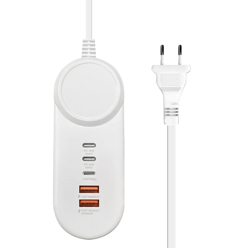 Мережевий зарядний пристрій Hub 35W — це універсальний та потужний адаптер, розроблений для одночасного заряджання декількох цифрових пристроїв. Завдяки наявності п'яти різних портів, цей хаб стає ідеальним рішенням для дому чи офісу, замінюючи собою кілька окремих блоків живлення. Компактний корпус виконаний із міцних вогнетривких матеріалів, що гарантує безпеку під час експлуатації.