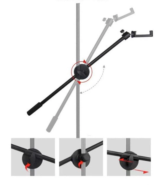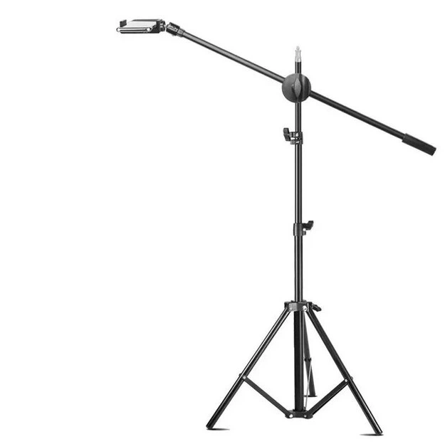 Конструкція виготовлена з міцного алюмінієвого сплаву, що гарантує стабільність та довговічність. Висота штатива регулюється в діапазоні від 55 до 170 см, що робить його зручним як для настільної, так і для підлогової зйомки. Універсальний тримач підходить для смартфонів шириною від 6 до 10 см, а спеціальне кріплення дозволяє встановити кільцеву лампу. Стійка журавель для телефону ідеально підходить для б’юті-майстрів, візажистів, фуд-блогерів та стрімерів.