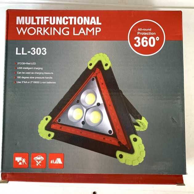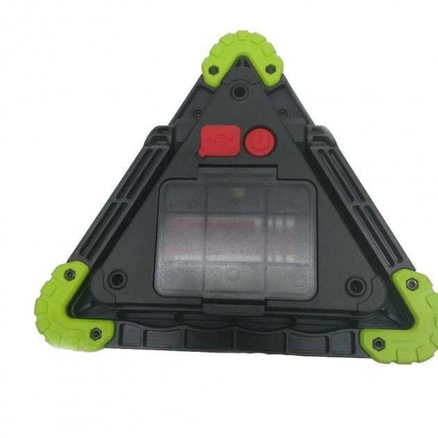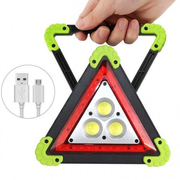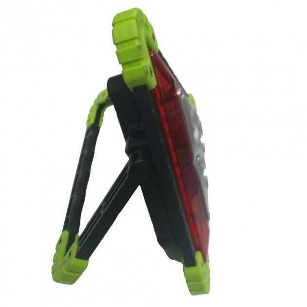 LED Прожектор Аварійний знак на акумуляторах Може заряджати електронні пристрої, наприклад, мобільні телефони!!! особливості: - Яскравий та потужний світлодіодний прожектор! Широким і потужним променем цілком спокійно освітлює 20-30 метрів! - Режим знака аварійної зупинки зі світлодіодним підсвічуванням червоними світлодіодами! - Також передбачено режим миготіння для максимального привернення уваги. Такий знак видно здалеку! - Зручна поворотна ручка для встановлення, перенесення або підвішування прожектора - Можливість роботи від двох знімних акумуляторів 18650 (поставляються в комплекті з пристроєм) або від 4-х звичайних пальчикових батарейок! - Можливість підзарядки від будь-якого USB зарядного пристрою (в комплекті постачається кабель для заряджання з USB штекером)! - Якісне складання! Корпус прожектора виготовлений з м'якого гумового пластику, стійкого до тріщин та пошкоджень!
