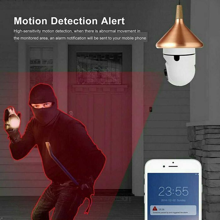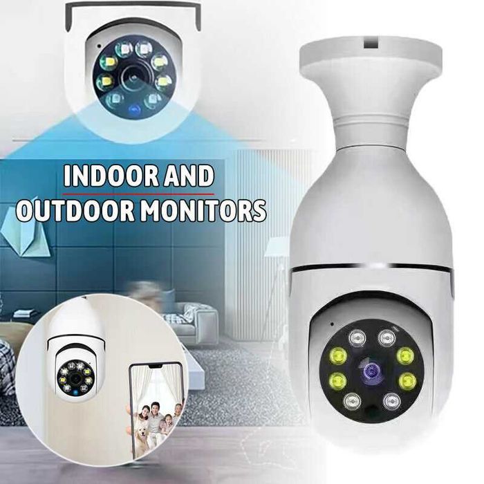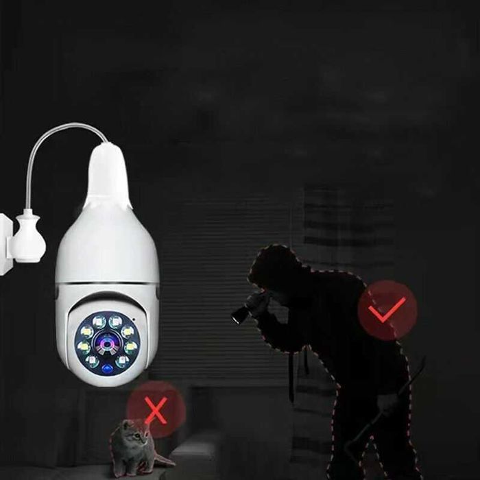 Тримач лампи-це універсальний патрон E27 , простий в установці. (входить у комплект). Дводіапазонний Wi-Fi Світильник, підтримка нічного бачення. 360 градусів панорамне обертання. Віддалений перегляд зі смартфона з любої точки земної кулі! Wi-Fi з'єднання, інтелектуальне виявлення руху людини , звукова та світлова сигналізація! Двосторонній голосовий зв'язок у реальному часі. 2 мільйони пікселів високої чіткості, максимальна підтримка карти пам'яті 128G, підтримка хмарного сховища та зберігання tf-карток. Призначення: використовується для моніторингу безпеки будинку, офісу, складу та контролю безпеки магазину. Застосування: підходить для всіх ситуацій із потребами моніторингу безпеки. Завдяки двосторонньому звязку може використовуватись як відеоняня. Дизайн зовнішнього вигляду: імітація форми лампи, компактна та кругла. Установка дуже проста, може використовуватися звичайний побутовий тримач лампи E27, без проблем з проводкою- можна вкрутити в любий плафон, люстру, настільну лампу.